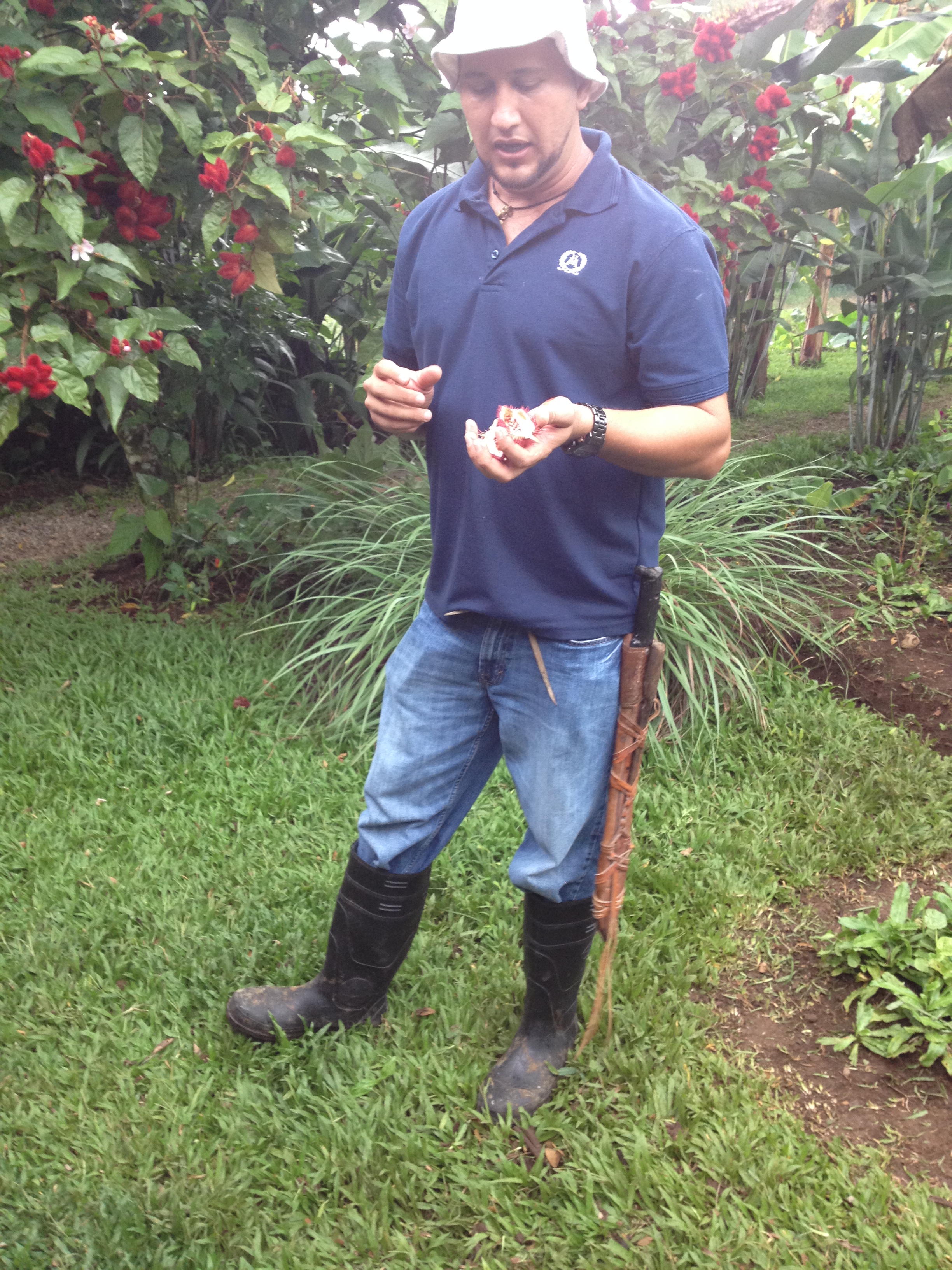 Taking risks are a part of being adventurous right?These rocks are from the eruption in the 1920’s.So sweaty after making it to the top.Nature at it’s finest.“Look deep into nature, and then you will understand everything better.” -Albert EinsteinProbably the only flower of it’s kind that I saw near the Volcano.Just swingin’What a beautiful view.Remember that happiness is a way of travel and not a destination.Oxen used to press sugar cane in the sugar making process.A shot of homemade sugar can rum.The fruit on this tree can be used as food dye and coloring for things such as lipsticks and ceremonies.Molasses molds.Making Torillas.Finished product.Baldi Hot Springs.Beautiful view of the sunset from my room.… and I decided to end my adventurous weekend off with a massage.